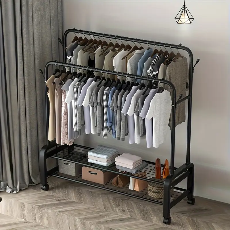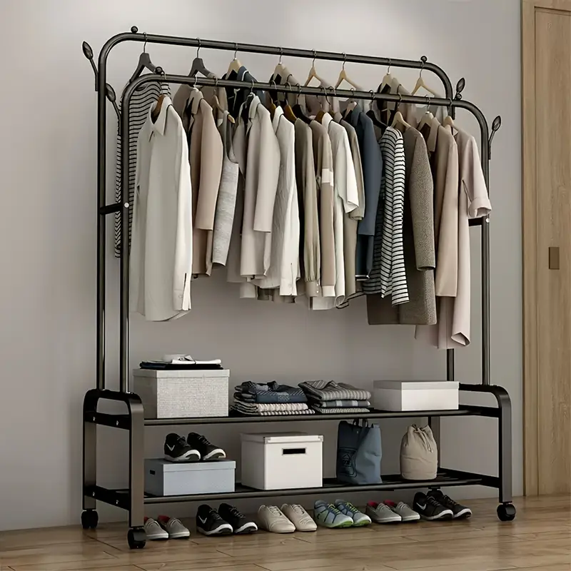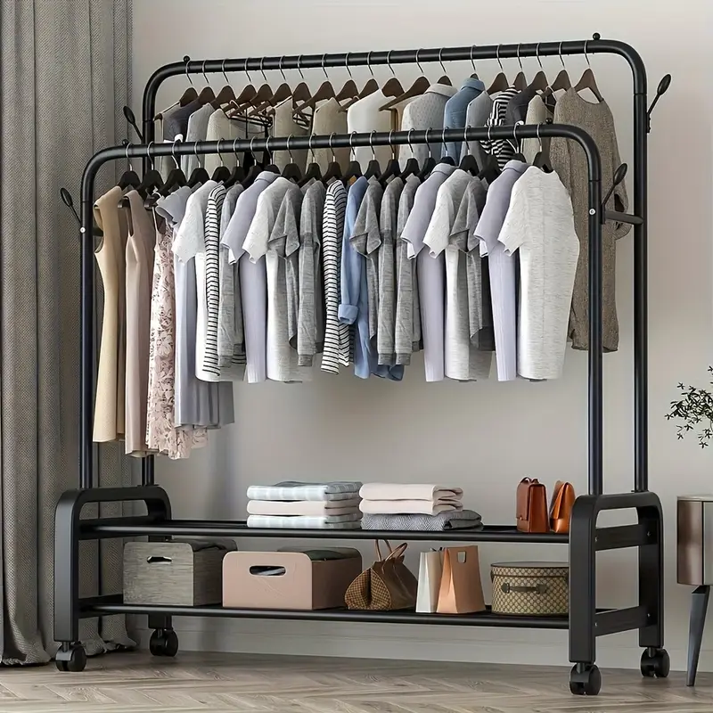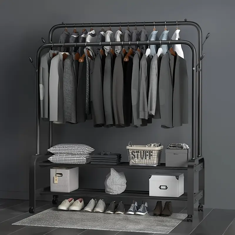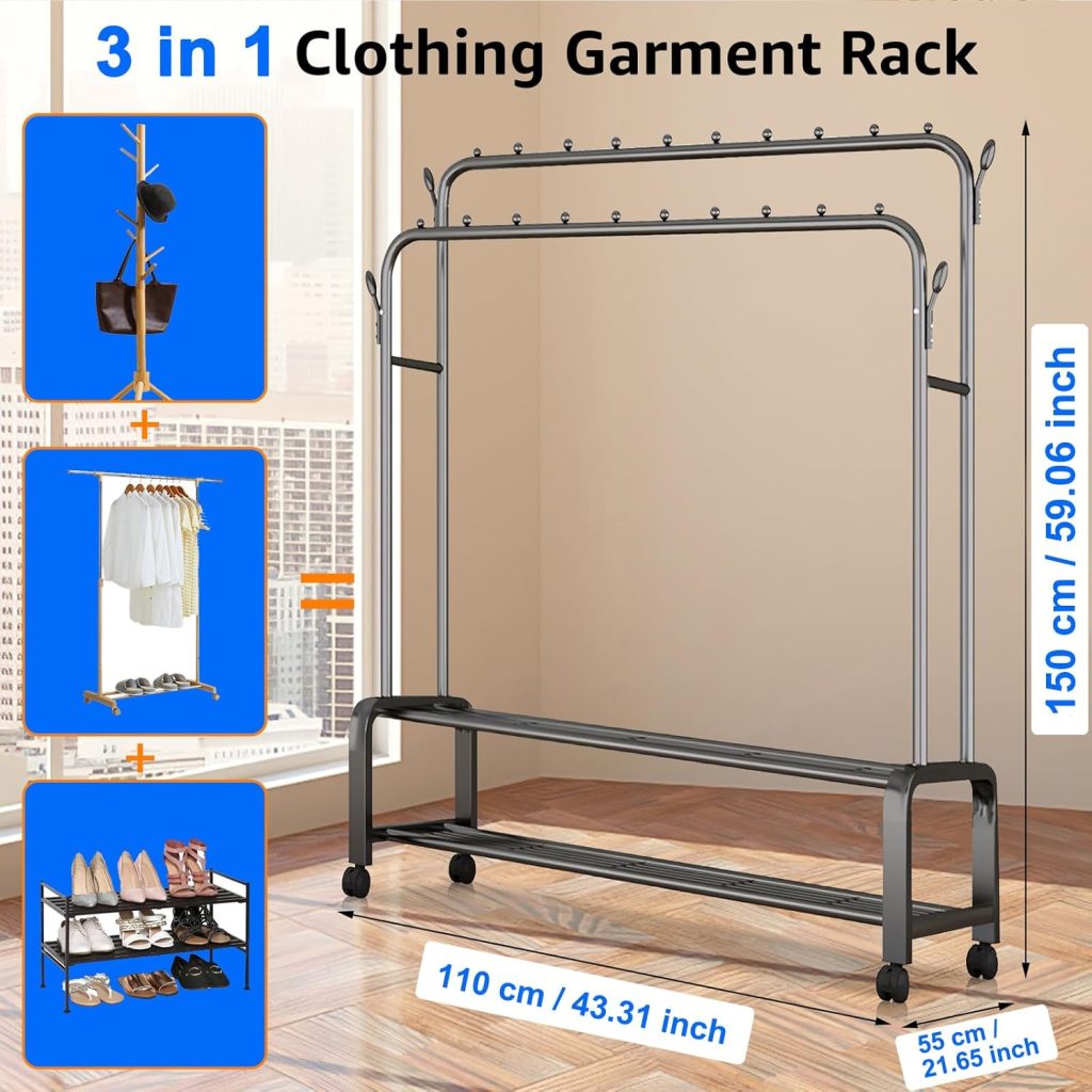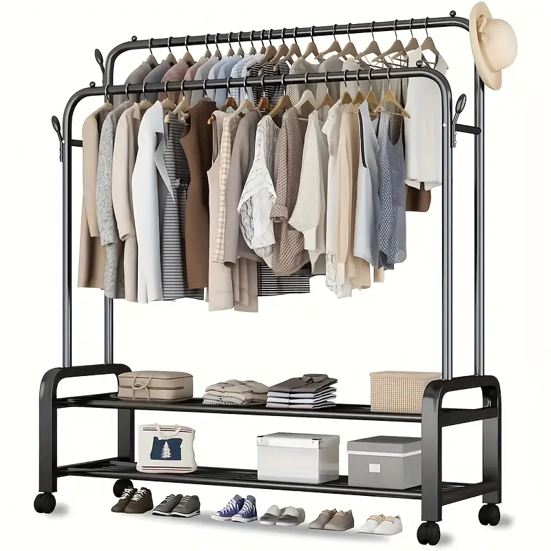 ADJUSTABLE DOUBLE ROD METAL CLOTHES RACK WITH SHOE AND HAT HOLDER