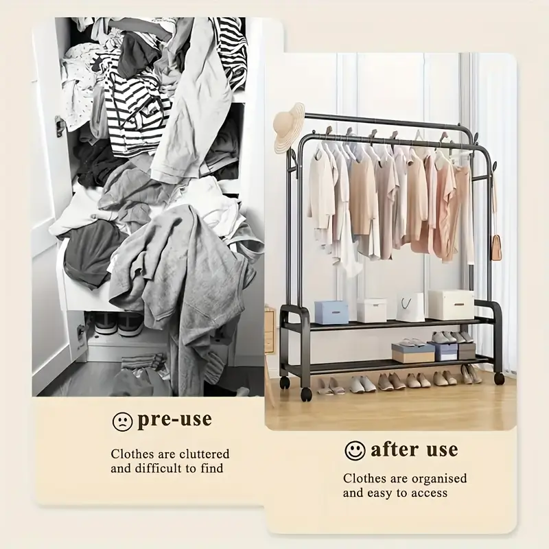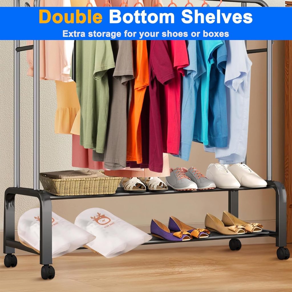 ·[MULTIFUNCTIONAL]: This clothing rack features a high-low rod style, providing ample space for hanging clothes, shirts, pants, and even long skirts. The bottom shelf is ideal for storing shoes or storage boxes. The four hooks on the side also offer a perfect place to hang hats, scarves, and bags.